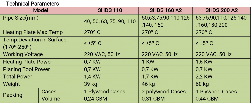 Pada mesin SHD manual 2 clamps handpush terdapat 3 jenis mesin, yaitu : SHDS 110, SHDS 160 dan SHDS 200. Dalam setiap unit mesin terdiri dari : basic frame, pemanas (heating plate), planning tool (serut), tool box dan manual book. setiap pembelian mesin ini akan mendapat garansi mesin resmi selama 1 tahun.