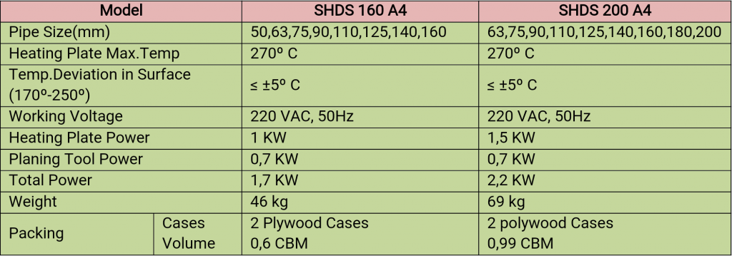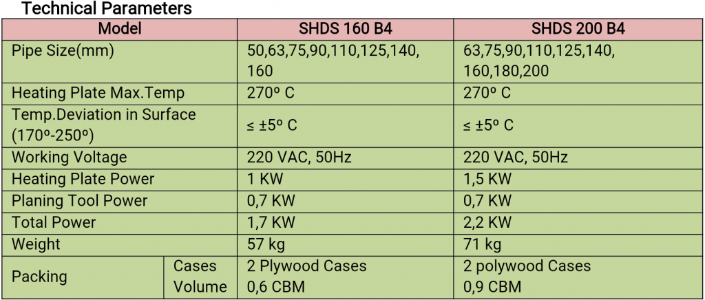 Pada mesin SHD manual 4 clamps handwheel terdapat 2 jenis mesin, yaitu : SHDS 160 dan SHDS 200. Dalam setiap unit mesin terdiri dari : basic frame, pemanas (heating plate), planning tool (serut), tool box dan manual book. setiap pembelian mesin ini akan mendapat garansi mesin resmi selama 1 tahun.